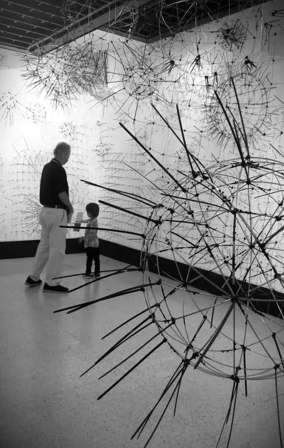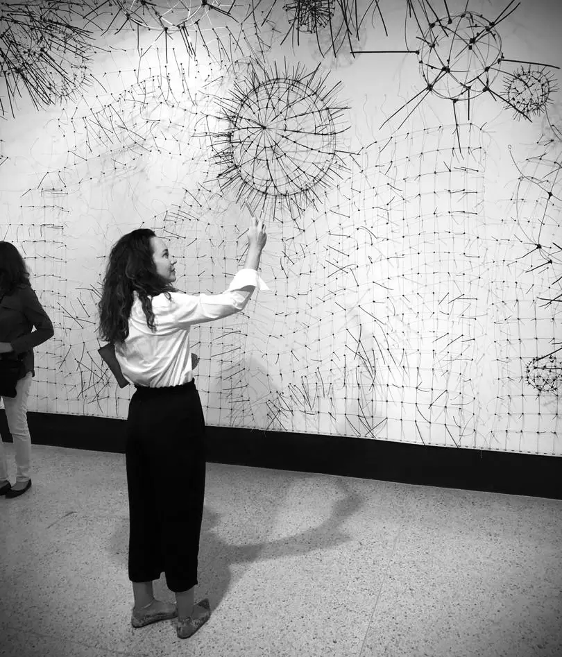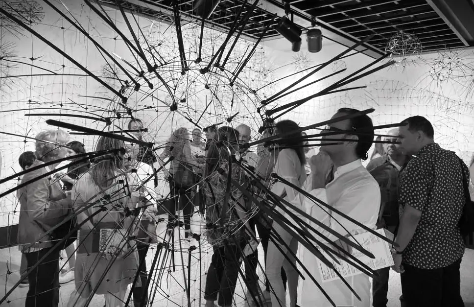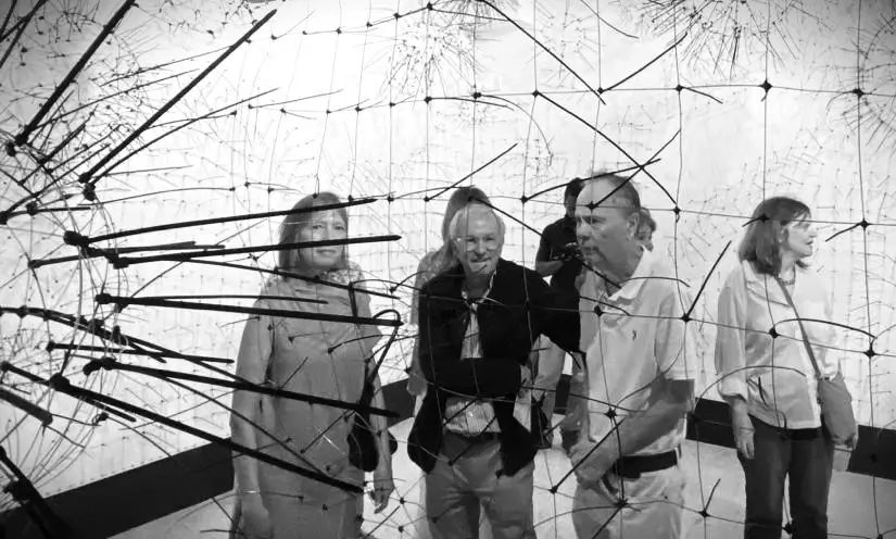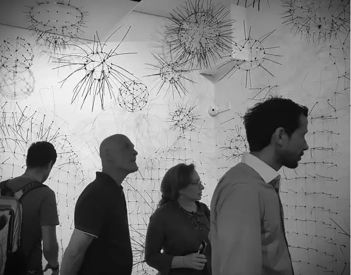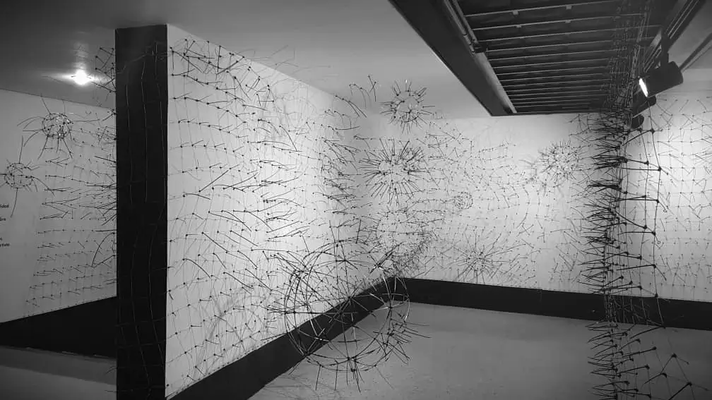 De lo geométrico a lo orgánico, del orden al caos, de lo individual a lo colectivo, de lo singular y lo plural. Partiendo del metal en rayas rectas, curvas superpuestas y entrecruzadas que forman una retícula de cuadrados y triángulos, se recrea nuestra realidad. Las líneas representan las partes de una sociedad: su cultura, sus normas, su política, su contexto natural, sus prejuicios, su hábitat, etc. Simétrica, medible, predecible, tal y como intenta el hombre racionalizar y explicar el desarrollo de la colectividad, del país y del mundo, pero a la vez en movimiento, flexibles, distorsionadas, con elementos que parecen tener vida propia representan ese otro lado de nuestra sociedad en caos y cambio permanente. Adicionalmente, en los cruces o intersecciones de las líneas surge otro material completamente opuesto al metal que crea una nueva dimensión «virtual», una línea adicional más flexible e impredecible, ésta representa el resultado de esa interacción y de la variable imposible de pronosticar, controlar y mucho más difícil de explicar. Para enfatizar la anatomía de la pieza, las sombras, su interacción con el espectador y el juego que producen, completan una realidad dinámica, impredecible e indescifrable. En la escritura especular1 de Da Vinci, será en el
