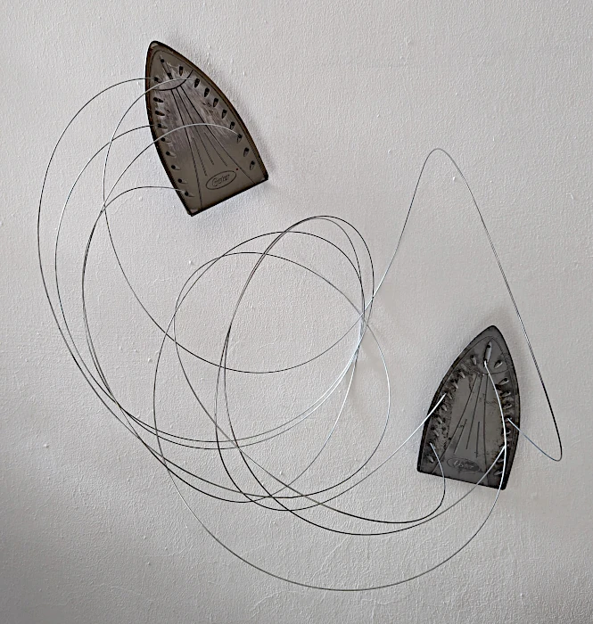 Aunque mis piezas tienden a tener aspecto más masculino, en parte por los materiales utilizados y en parte por los propios conflictos internos sobre la propia feminidad, en esta ocasión hay una intención muy deliberada de incluir, además, elementos simbólicos del papel de la mujer como ama de casa. Claro está que planchar y coser son actividades de un estereotipo femenino algo anticuado y que intentamos dejar atrás. Los objetos reciclados incluidos, partes de planchas y botones, tienen connotaciones propias. Han sido usados por mujeres que son más que una actividad del hogar. Super mujeres que con ambición y agallas lograron trabajar en actividades no tradicionalmente femeninas además de hacer sus labores cotidianas del hogar. Aunque en sociedades y familias más avanzadas hemos visto avances hacia un equilibrio entre hombres y mujeres, sabemos que todavía queda mucho camino por recorrer.